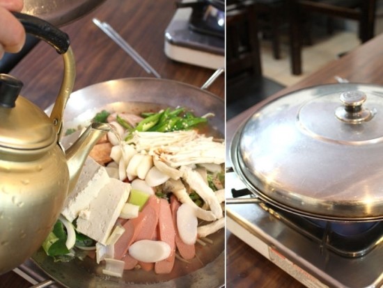 stew with squid and pork along with tofu, mushroom, watercress, rice cake and noodles.